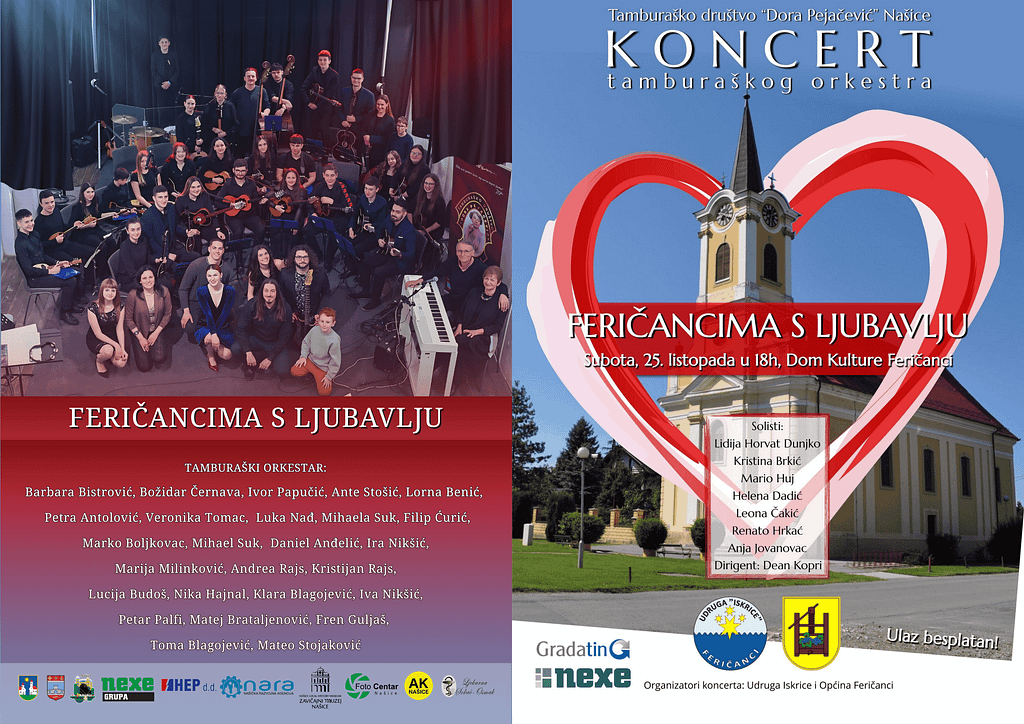 Feričanci, 25. listopada 2025. – U prepunoj dvorani Doma kulture u Feričancima održan je koncert „Feričancima s ljubavlju“, u organizaciji Općine Feričanci i Udruge Iskrice. Publika je imala priliku uživati u jedinstvenom glazbenom doživljaju koji je priredio orkestar Tamburaškog društva „Dora Pejačević“ Našice pod ravnanjem Deana Koprija te vrhunski solisti.